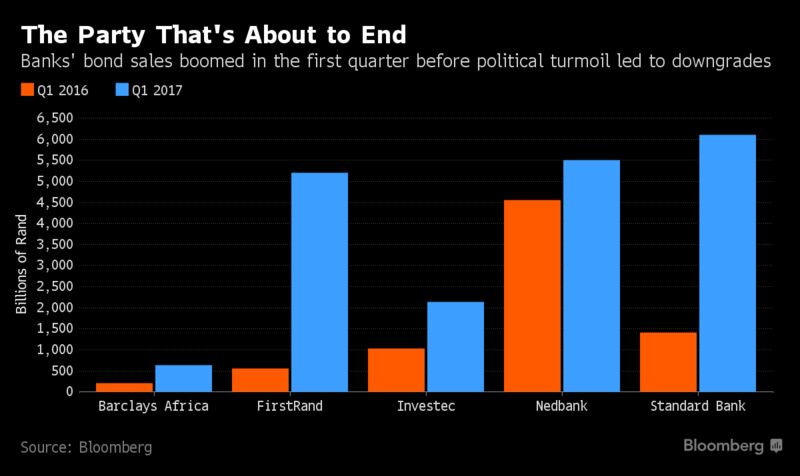 South Africa’s largest banks were expected to accelerate lending in 2017 with economic growth seen improving after an expansion of 0.3 percent in 2016, the slowest pace since the 2009 recession, Ernst & Young LLP said on March 7. An improvement in non-performing loans was also seen as boosting the granting of credit, it said. That may no longer be the case as rand weakness typically spurs inflation, which curbs spending and the fees banks make off transactions, while making loans harder to repay.The cost of issuance “has already increased,” Sam Moss, a spokeswoman for Johannesburg-based FirstRand Ltd., said by email on April 11. Any future sales will have to be determined by demand for credit, she said. FirstRand, Africa’s largest bank by market value, had started increasing debt issuance just two months ago to meet rising investor demand and benefit from declining borrowing rates.