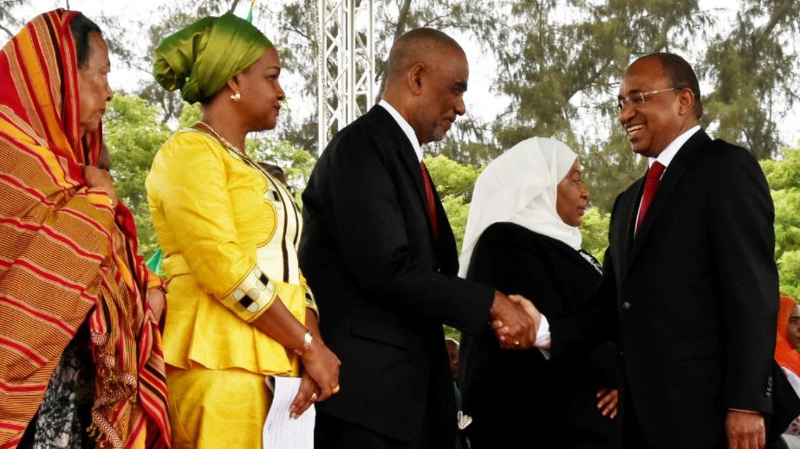 President Hussein Mwinyi greets the First Vice President Maalim Seif Sharif Hamad at Mnazi Mmoja Grounds during the celebration of Revolution Day on January 12