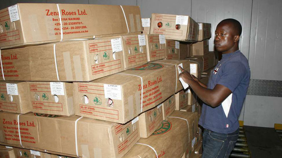 A cargo handler labels boxes of flowers for export at JKIA. PHOTO | FILE