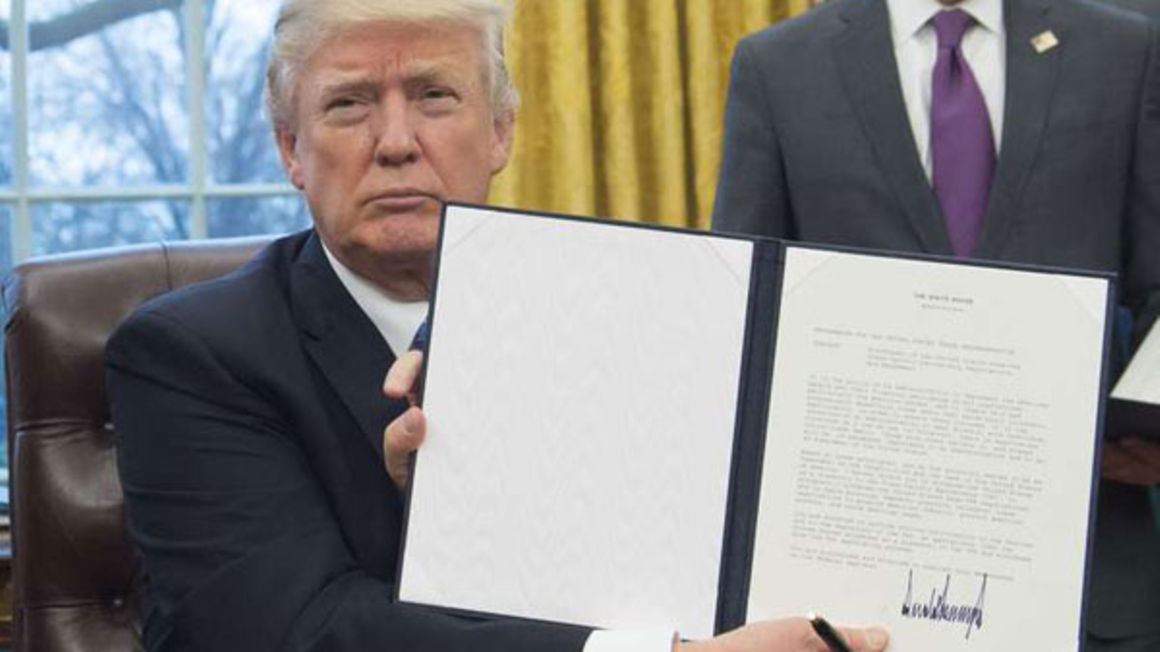 President Donald Trump holds up an executive order withdrawing the US from the Trans-Pacific Partnership after signing it in the Oval Office of the White House in Washington, DC, on January 23, 2017. PHOTO | SAUL LOEB | AFP