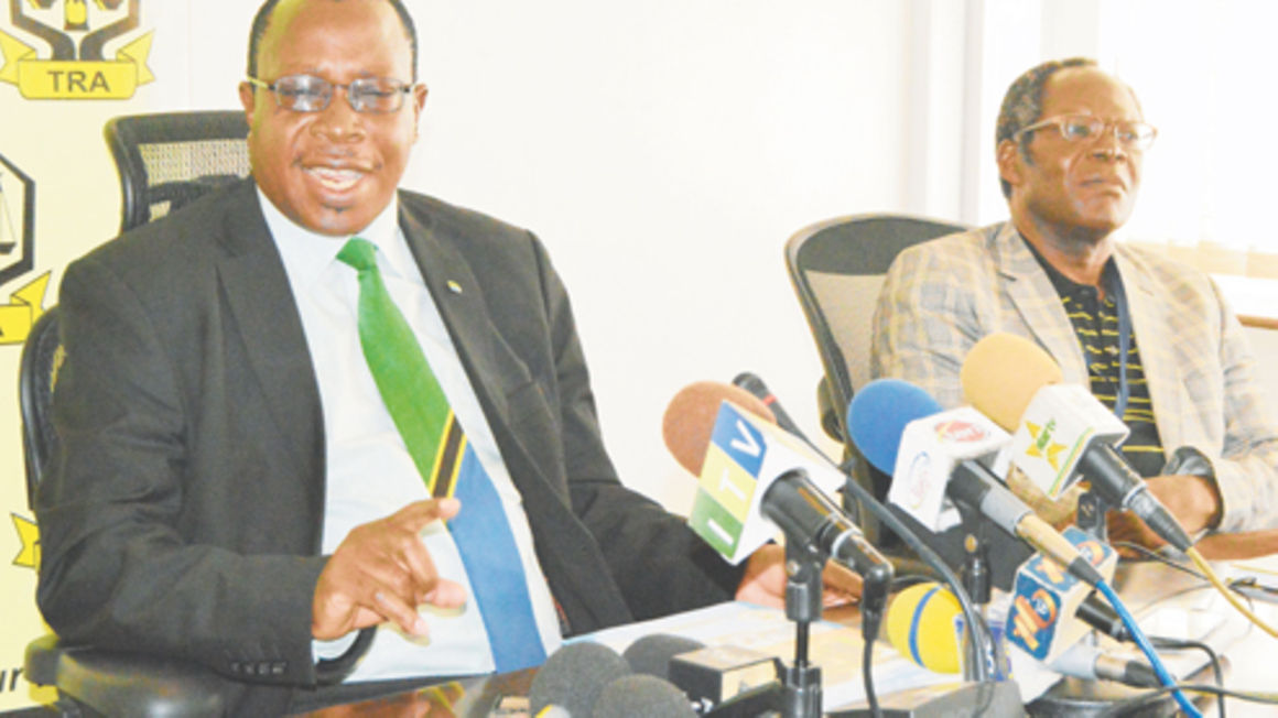 The Finance and Planning minister, Dr Philip Mpango (Left), addresses the media when he served as acting commissioner general of the Tanzania Revenue Authority .PHOTO | FILE