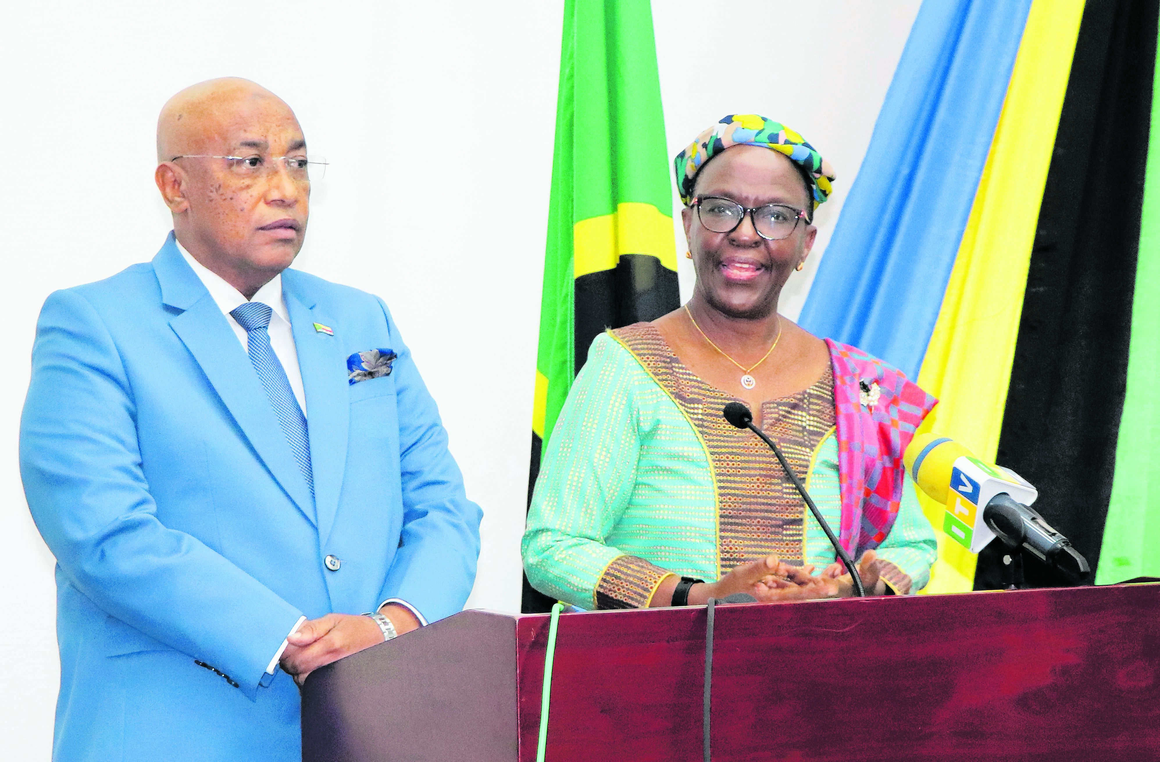 Minister for Foreign Affairs and East African Cooperation , Liberata Mulamula speaking during a press conference in Dar es Salaam yesterday. With her is the Comoro ambassador to Tanzania, Dr Ahamada Mohaned. PHOTO | SUNDAY GEORGE