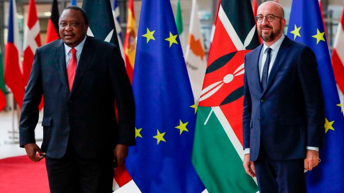 European Council President Charles Michel (right) welcomes President of Kenya Uhuru Kenyatta prior to a meeting at the European Council headquarters in Brussels, on June 21, 2021. PHOTO | AFP