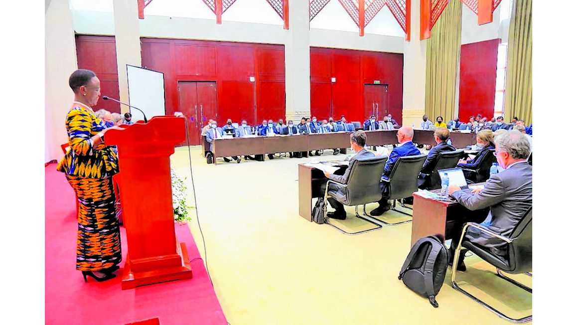 Foreign Affairs and East African Cooperation Minister Liberata Mulamula gives an address during a political dialogue between Tanzania and European Union in Dar es Salaam yesterday. PHOTO | COURTESY