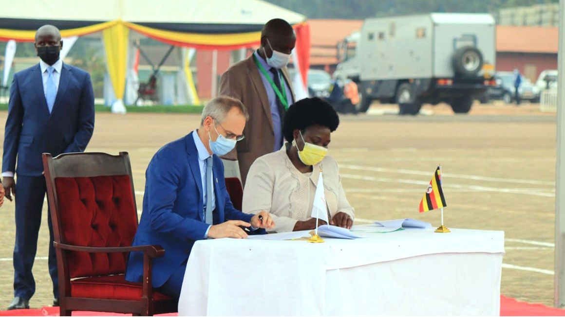 TotalEnergies General Manager Philippe Groueix and Uganda's Energy Minister Ruth Nankabirwa signs renewable energy agreements during a ceremony presided over by Ugandan President Yoweri Museveni and Tanzanian Vice President Phillip Mpango in Kampala on February 01, 2022. PHOTO | COURTESY |