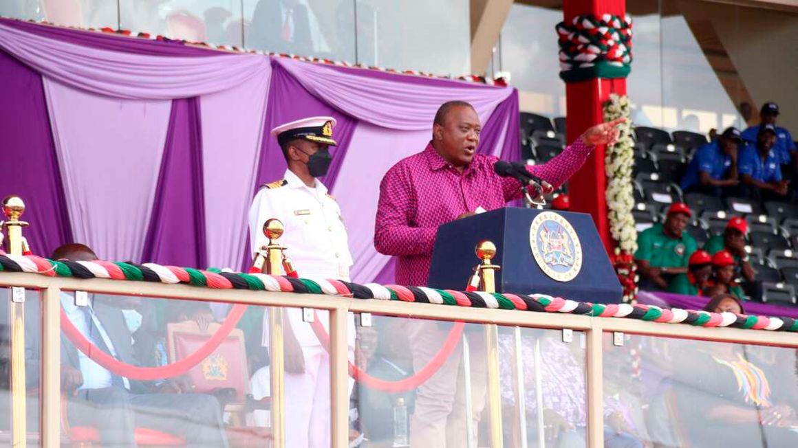 President Uhuru Kenyatta making his speech during Labour Day celebration at Nyayo National Stadium in Nairobi on May 1, 2022. PHOTO | LUCY WANJIRU | NMG