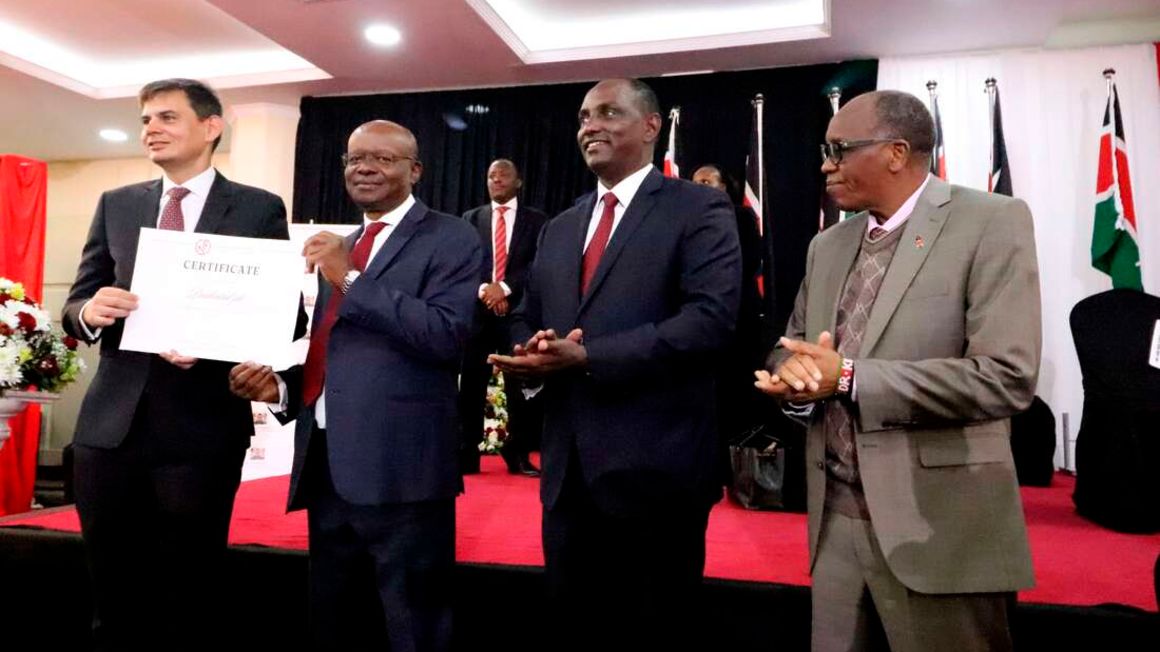 L-R: Prudential Africa Chief Operating Officer Nick Holder, NIFC Authority chairman Vincent Rague, Treasury CS Secretary Ukur Yatani and Head of Public Service Dr. Joseph Kinyua, after the presentation of a certificate to Prudential Africa as the first NIFC firm. PHOTO | DIANA NGILA | NMG
