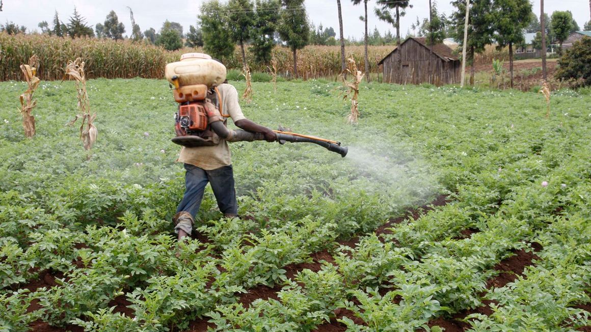 A worker sprays a potato crop with pesticides and herbicides in Elburgon, Nakuru County. PHOTO | JOHN NJOROGE | NMG
